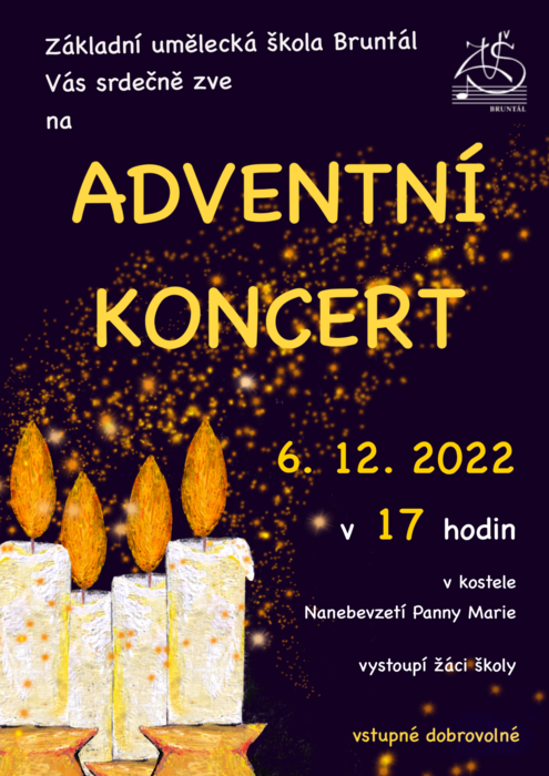 Srdečně Vás zveme na Adventní koncert žáků naší školy. Na programu jsou sólová a také souborová čísla, uslyšíte různé hudební nástroje i sólový zpěv. V závěru koncertu zazpívá dětský pěvecký sbor Sluníčko. Několik vánočních písní si pro Vás připravili i nejmenší muzikanti z přípravné hudební výchovy. Koncert se koná v úterý 6. prosince ve farním kostele (naproti ZUŠ).